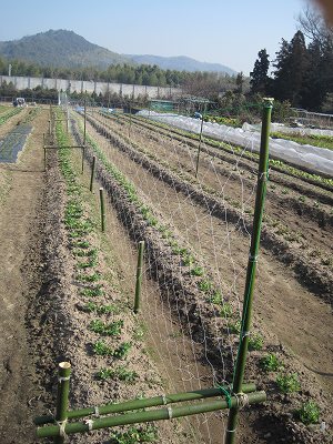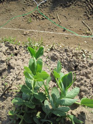 一生懸命ネットに手を伸ばしてるエンドウ豆。