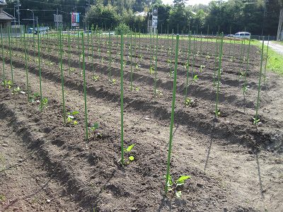 いやあ^^たくさん植えておられますなあ^^お疲れ様です^^うちもこの間、なすを45本にピーマンを20本植えました^^九州は竹が多いので、支柱には竹を使います。資材費はかかりませんが、毎年竹切りの手間がかかります。のんのんさんのところは、始めたばかりだから、初期投資が大変ですが、毎年、それも少なくなってきますよ^^