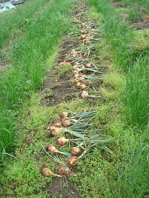 ちょっと前から収穫を始めている晩生の玉ねぎ。