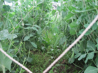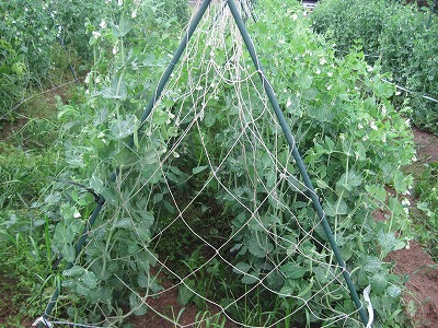 合掌に支柱を立てた間にエンドウがたくさん見えたので、
