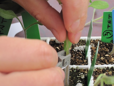 台木と穂木を双葉の下でそれぞれ切り取り、