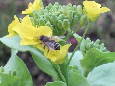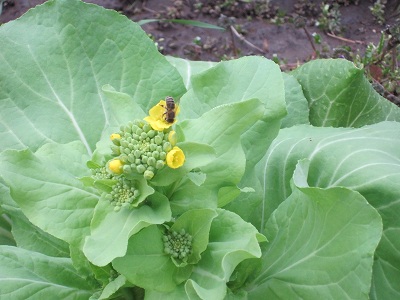 結球しなかった白菜から出てきた菜の花にミツバチ発見!