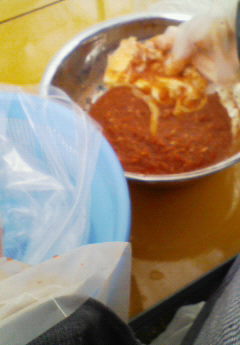 真っ赤なキムチの素が服に飛んで、服に真っ赤な点々が・・・。