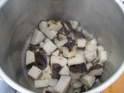 そして、1.5センチのサイコロに切って圧力鍋にかけます。